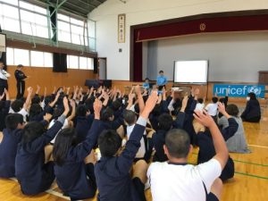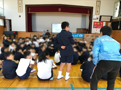 今回は「命について考える集会」ということで、世界の子どもたちやユニセフのことを伝えながら、命について考えていただきました。