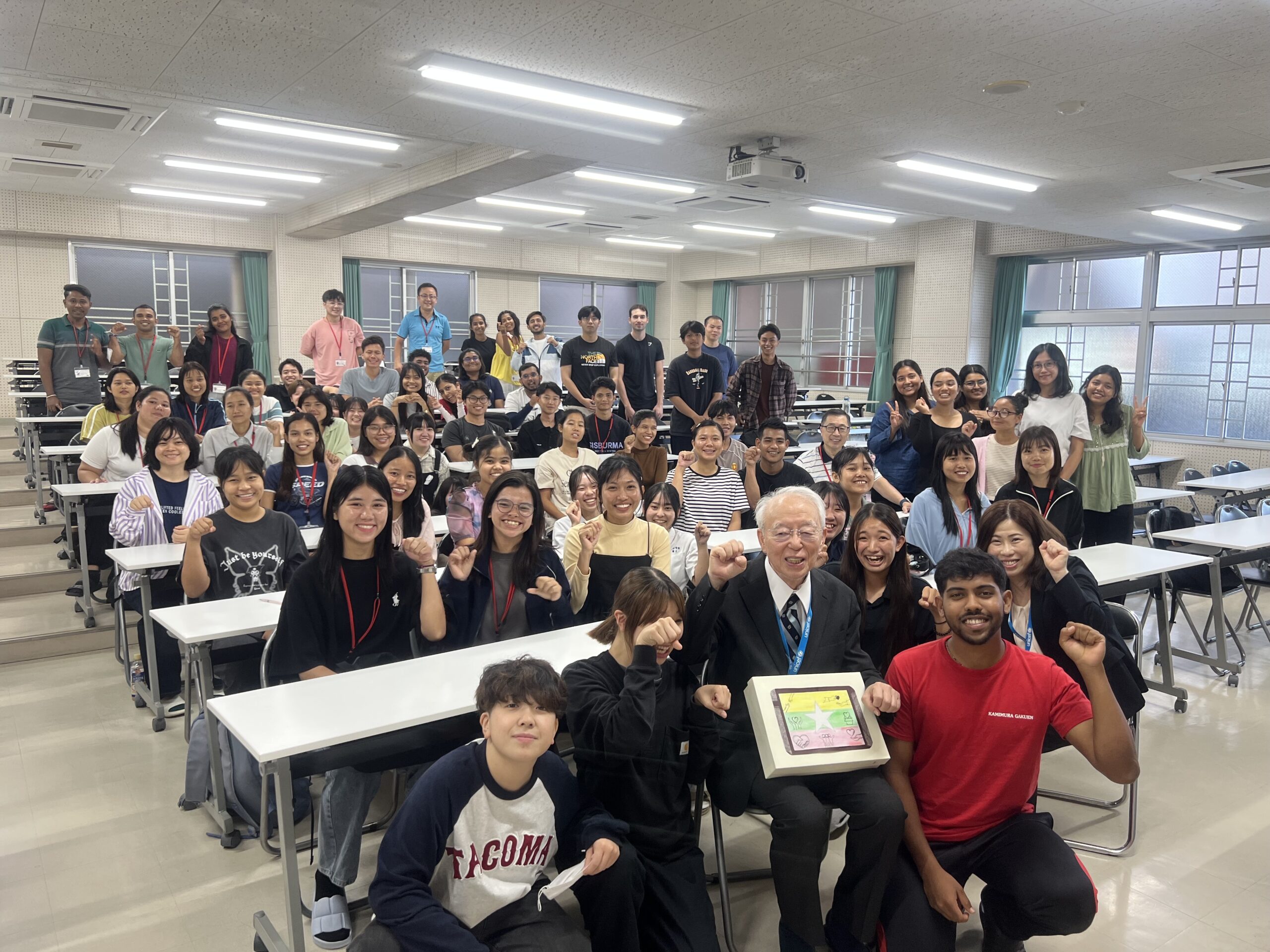 神村学園専修学校学友会 ミャンマー地震募金 贈呈式 活動報告 2025.11.18 神村学園専修学校の日本語学科には32名のミャンマーの学生が在籍しています。学友会の方々が中心となり、ミャンマー地震の緊急募金を募り、10月8日(水)に贈呈して頂きました。